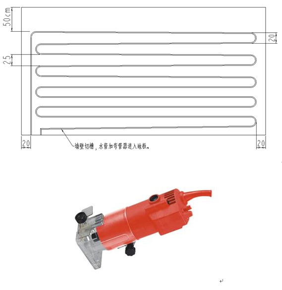 等墻壁上完全貼滿(mǎn)后,在保溫板的面上設(shè)計(jì)并畫(huà)好需要開(kāi)槽的水路圖形。要求**上面管路的位置倒天花板的距離為50厘米;水路的兩端間距分別為20厘米和25厘米,間距20厘米的一端為圓弧過(guò)渡,保證水路為傾斜向下;水暖管路距離兩側(cè)的墻壁端距離約為20厘米。